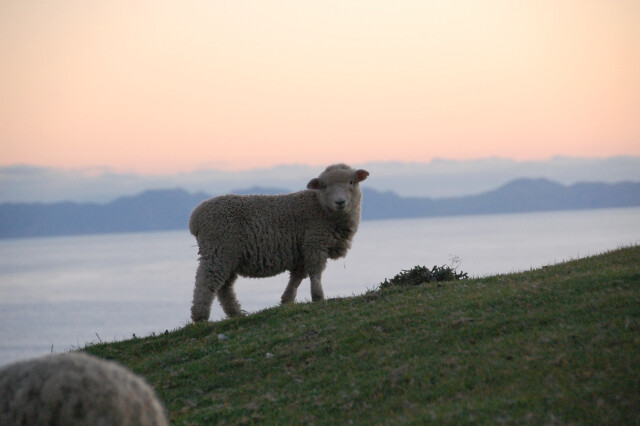 Near Raglan, a sheep on the slops in the morning.