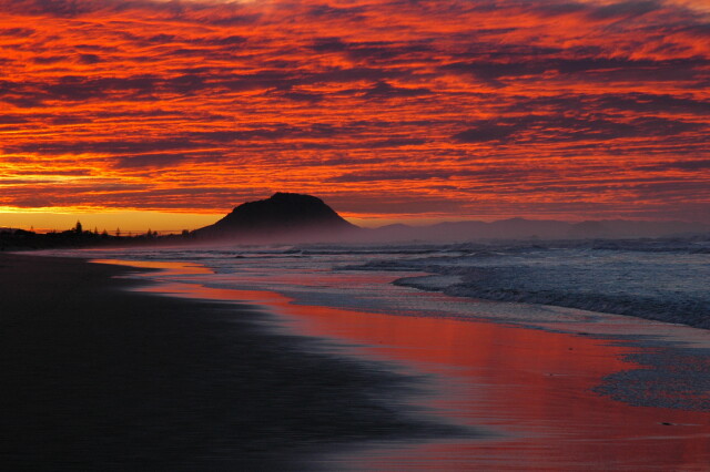 A spectacular display in the clouds showing Mount Maunganui viewed from Papamoa beach